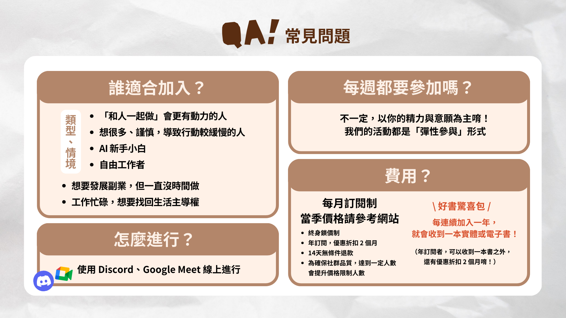 (為維護社群交流品質,目前只開放 10 個名額唷!額滿就要等下一季了)